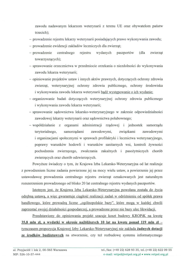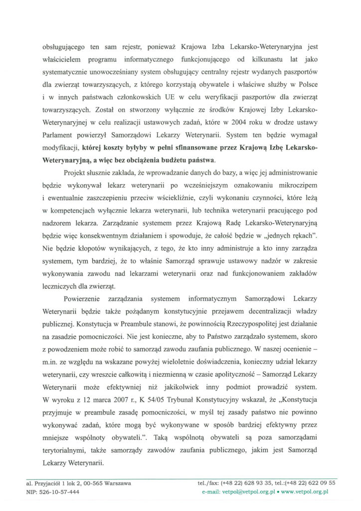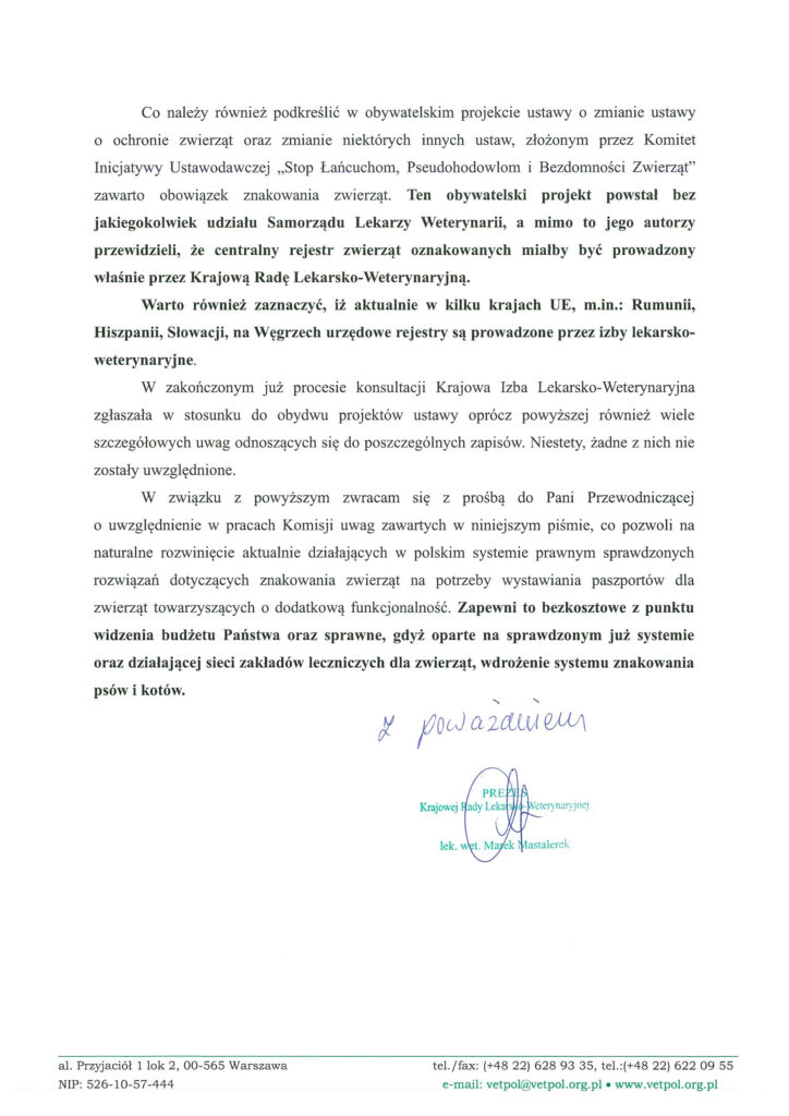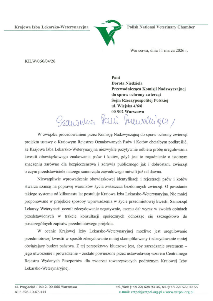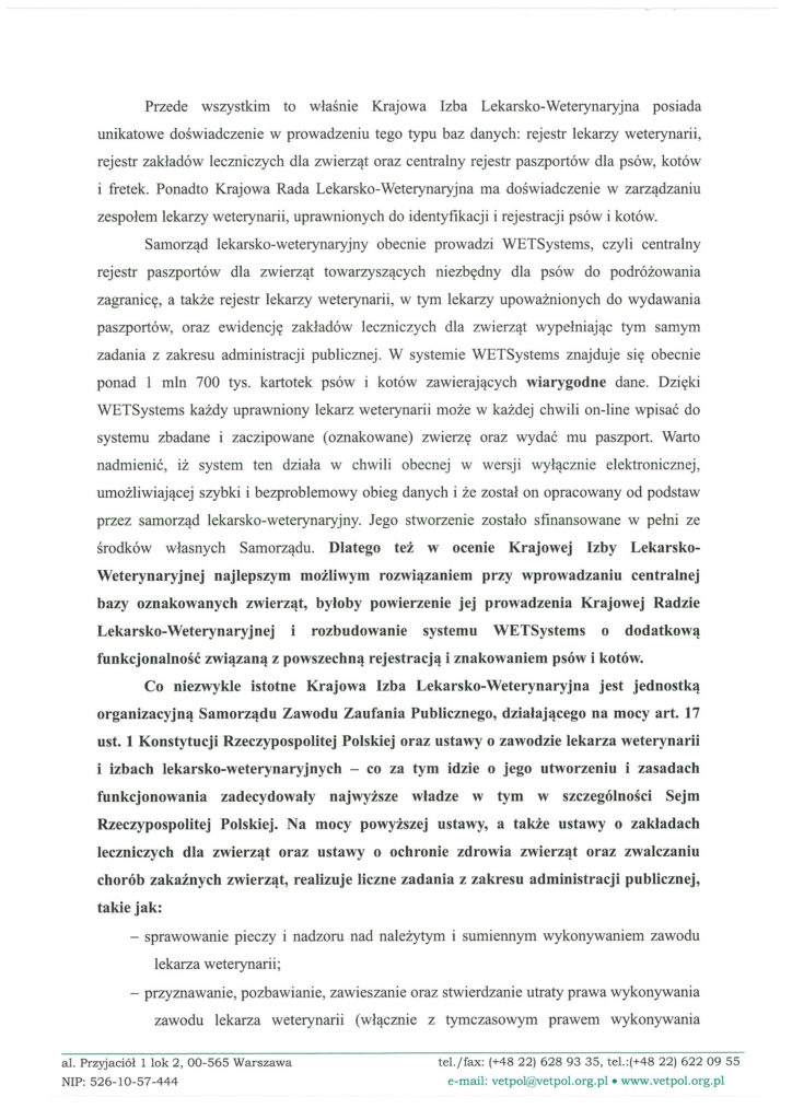 W związku z tym Krajowa Izba Lekarsko-Weterynaryjna zwraca się do Komisji o uwzględnienie przedstawionych uwag i rozważenie powierzenia prowadzenia centralnej bazy oznakowanych zwierząt samorządowi lekarzy weterynarii, co pozwoliłoby szybko i bez dodatkowych kosztów dla budżetu państwa wdrożyć system powszechnej identyfikacji psów i kotów.
